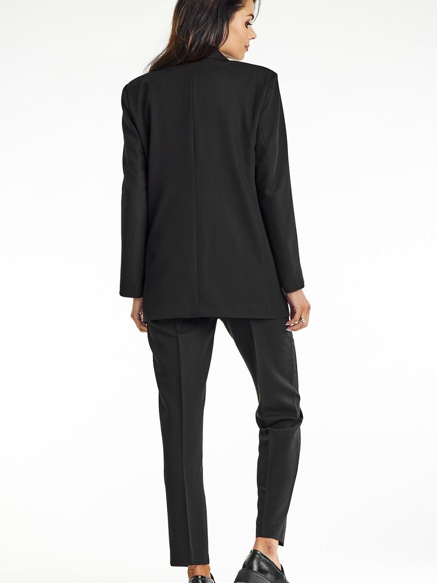 Elegancki żakiet o luźnym kroju w kolorze czarnym. Odkryj elegancję z naszym czarnym żakietem o luźnym kroju, łączącym casualowy komfort z wyrafinowanym stylem. Idealny na różne okazje, żakiet zapewnia swobodę ruchów i profesjonalny wygląd. Uszyty z wysokiej jakości tkaniny z dodatkiem wiskozy, miękki i wygodny. Kontrastowa podszewka dodaje oryginalności, a możliwość podwinięcia rękawów wprowadza modny akcent. Zapinany na guzik z logo, z eleganckimi patkami kieszeniowymi. Świetnie komponuje się z t-shirtami, koszulami i golfami. Pasuje do spodni z tej samej tkaniny oraz bardziej casualowych stylizacji.